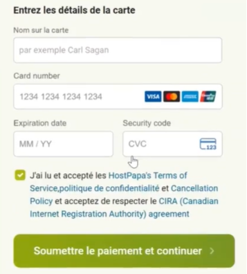 - Complétez également les détails de la carte de crédit, cochez la case des termes et conditions et cliquez sur "Soumettre le paiement et continuer".