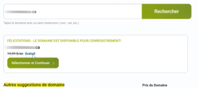 - S'il est disponible, il se trouvera juste en-dessous de "Autres suggestions de domaine".